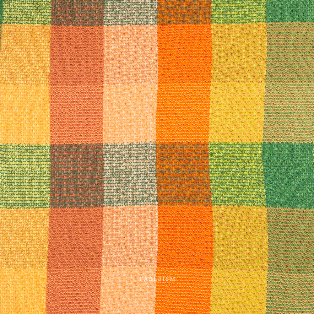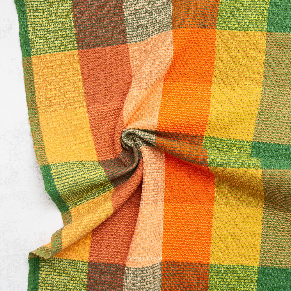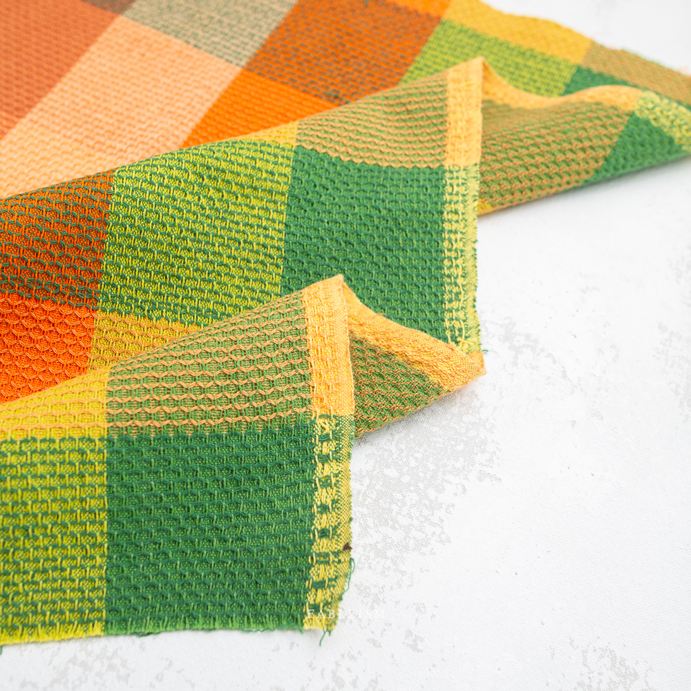 The Waffle Happy Checkers collection by Fableism is a wide width (54/55″) fabric line defined by its bold scale, waffle texture, and lively color play. Woven with a pronounced waffle-like surface, each fabric has a soft hand and visible depth that adds character and movement, making it especially striking in larger projects like home decor, quilt backings and garments! The design features oversized yarn-dyed squares measuring approximately 3 x 3 inches, giving the collection a modern graphic feel while still nodding to classic check patterns. The colors in this 100% cotton fabric are layered and nuanced — rich jewel tones, warm oranges and peaches, grassy greens, sunny yellows, and cool blues — often paired with soft pastels.